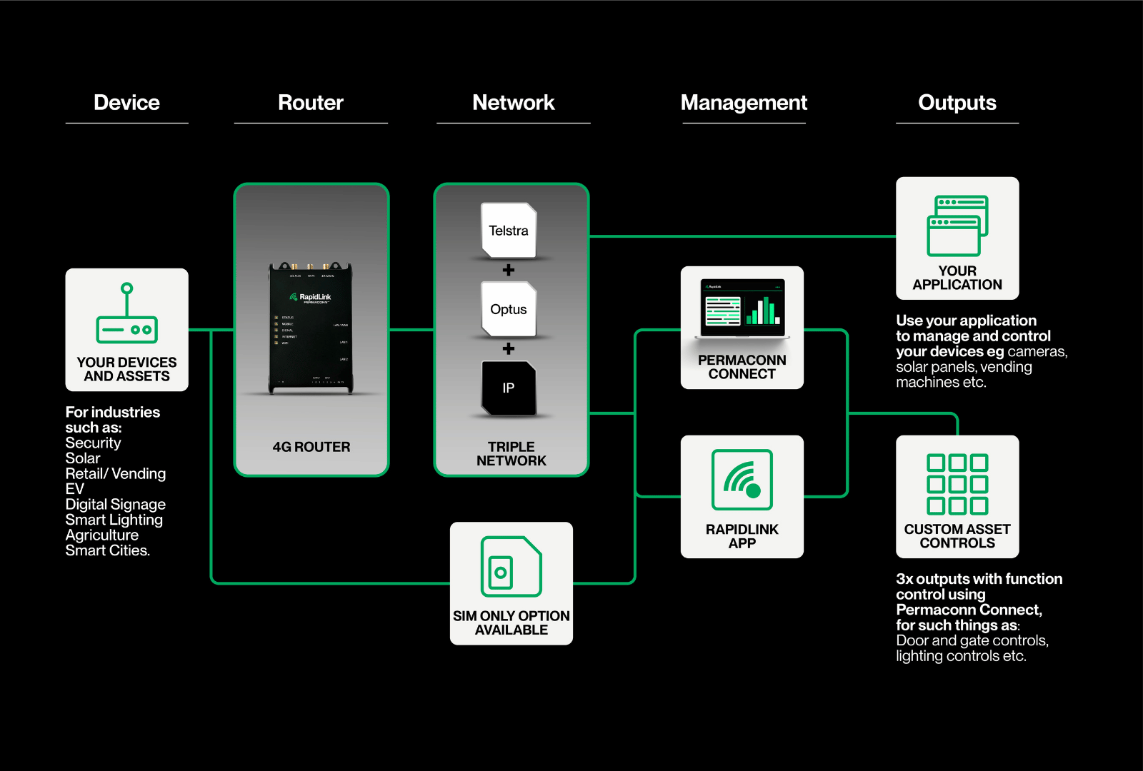 Combining our 4G RapidLink Router, triple network capabilities (Dual SIM + IP) and management portal into one service, reduces complexity and provides unmatched visibility and control. While we manage the telecommunication providers on your behalf, saving you an enormous amount of time.